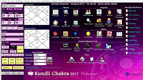 About this item - Better Home screen Interface for quick access, with Birthdata on left panel, provides more visibility and ease of use. Home screen now also has Lagna and Navamsa chart for quick study and all other subjecs are quickly accessible from the same single screen. Quick settings like Language, chart etc on home screen. - Interactive Chart Study: The Birth Chart is specially designed to give you information about the planet on chart itself. Also there is no need to click any planet. Just point on it. Prashna Charts (Horary): Horary or Prashna Kundli is well known method for predicting horoscopes and questions. Prashna charts and worksheets can be prepared based on: Horary (KP) number, Real timing and customised settings for Lagna and KP system, SPS system..etc. You can also define your own Lagna and continue. - Printing of Worksheet : You can print the worksheet in display for studying on landscape layout of page. Multiple Horoscope / Kundli. Transit: Specially designed transit worksheets. Also features Transit Graph useful for financial astrology and Detailed Transit Wheel with aspects, nakshtra, rashi, charan. On transit wheel (as shown in image) you can also select aspects to show with colour option and detailed study of Birth & Transit planets on Chart Wheel, with zooming facility to watch each planet and its aspects clearly. This is a specially designed Chart wheel, made after special analyses. Explore Numerology: Now the numerologists can explore major calculations of numerology with this utility, includes finding compatibility with partner as per date, compatibility as per name, compatibility with phone number, house number, vehicle no. etc. Also supports Chaldean and Pythagorean methods for calculations. Predictions: Manglik Dosha, Yantra - Mantra - Ratna(Lucky stones) suggestions, Sade Sati periods, Sade Sati explained, Sade Sati Remedies, Kaalsarpa Yoga, Tatwa based / General Characteristics(Nature, Financial, Health..etc), Nakshatra Phal, Graha Phal/Bhavfal, Numerology, Dasha Phal etc. - Muhurta analysis: Astrologers can define their own muhurta. Find auspicious timing for any date and can further minutely analyse each so found muhurta for accurate and best selection of Muhurta.