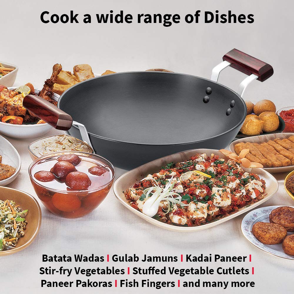 About this item Hard Anodised Aluminium - tough and durable, will not pit, tarnish or corrode and will stay looking new for years The Pan is ideal for sautéing and stir-frying foods using minimal quantities of oil. It can also be used for deep-frying and for cooking gravies, curries and sauces It is offered with elegant, comfortable Rosewood handles fixed on sturdy stainless steel brackets which are permanently riveted to the Pan. The handles are carefully designed to provide greater comfort and safety, particularly when handling heavy loads or hot oil The Pan has a round bottom for greater convenience during stir-frying Suitable for use on gas and kerosene stoves