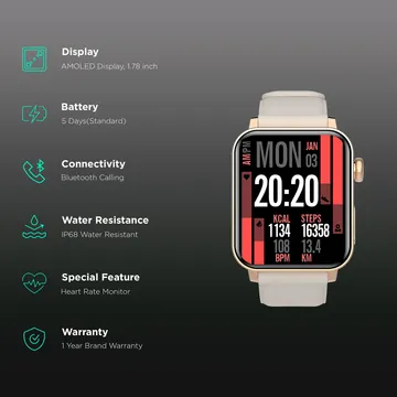 Key Features 4.52 cms (1.78 Inches) AMOLED Display Call & Text Function | Smart Notifications 100 Plus Sports Modes | 24x7 Heartrate & SPO2 Monitoring | Step Counting and Calorie Burn Tracking | Menstrual Cycle Tracking Upto 5 Days Battery Life IP68 Water Resistant 12 Months Warranty