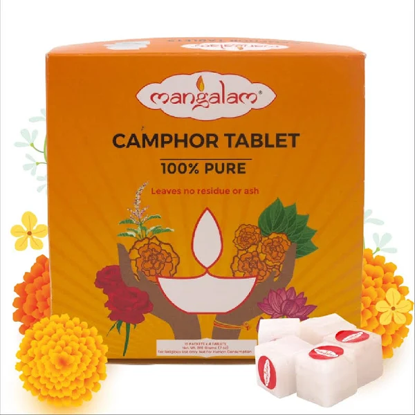 Mangalam camphor tablet pack is a product that holds utmost importance in Hindu culture. It is widely used for puja needs and worship rituals to appease gods and goddesses. In Hindu culture, pure camphor symbolizes union with God as it burns completely, leaving behind no trace. It is believed that burning pure camphor during aarti dispels negativity, keeps one healthy, and attracts prosperity.
