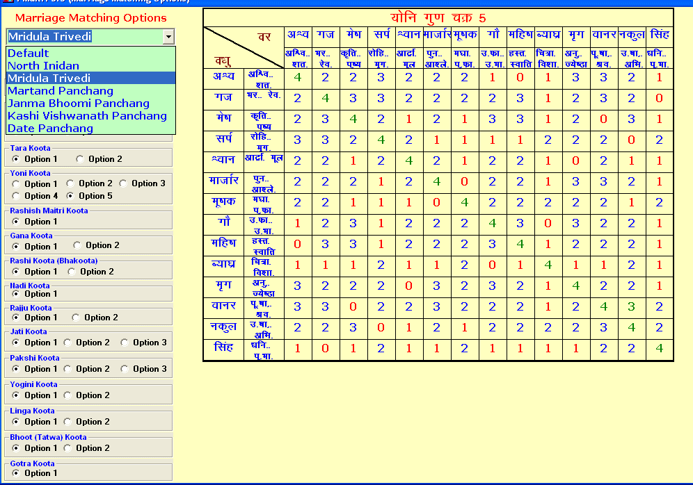 Kundali Matching software/Marriage Matching The structure of the institution of marriage is extremely complicated; it consists of various subjective and objective factors of a heterogeneous nature. Certain factors like family background, social status, financial affluence, physical appeal, educational accomplishments, professional attainments, etc can be easily viewed from outside; and decisions are often taken by basing on these external factors. The relationship between the two individuals evaluate scrutinize. A specific branch of astrology always takes into account compatibility between zodiac signs, planets and many others techniques.