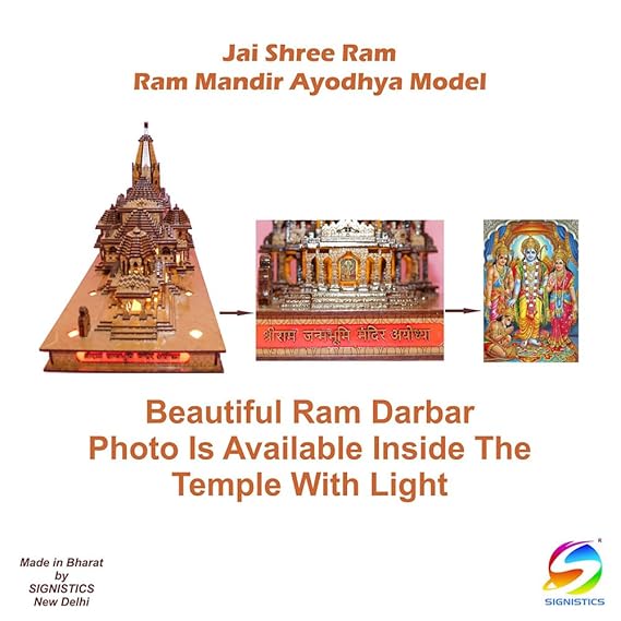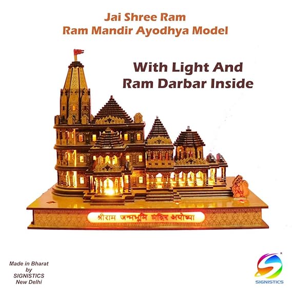 About this item Jai Shree Ram We offer a very beautiful hand crafted Shree Ram Mandir Ayodhya Temple model. (Model No: RMSL04) We have placed very attractive Shri Ram Lala Darbar image inside the Temple on and above Garbh Graha. Very beautifully hand crafted with inside lights gives a real look of our Ram Lala Ayodhya Dham. Made of medium density fiberboard (mdf) with led light inside. Size 10x8x6 Inches. Great gift for our parents loved one on birthday marriage anniversary dewali etc. Suitable for home, office, shop, work place, worship, mandir, temple, pooja, prayer, gift, etc