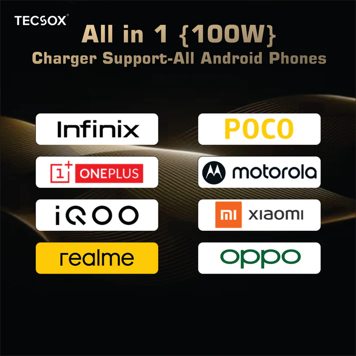 Specification: Output: 100W SUPER VOOC. Compatibility: All Android & USB-C devices. Design: Compact, portable. Safety: Overcharge, temp control, short circuit protection. Usage: Home, office, travel USP: 100W SUPER VOOC ultra-fast charging. Compact & lightweight for travel. Universal Android compatibility. Advanced safety: Overcharge, temperature, short circuit protection. Efficient, safe charging anywhere.
