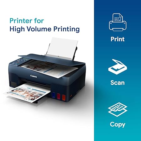 About this item Printer type: Inktank ; Functions: Print, Scan, Copy ; Printer output: Colour ; Connectivity: USB ; Scanner: Yes ; Scanner resolution: 600 x1200 dpi OS Compatibility: Windows 10 / 8.1 / 7 SP1 (operation can only be guaranteed on a PC with a pre-installed Windows 7 or later) macOS 10.12.6 ~ 10.15 ,Chrome OS ; Mobile connectivity : No ; Hardware Interface: USB 2.0, Enlarge/reduce option: No ; Duplex:No Maximum Print Speed (color): 5.0 ipm , Maximum Print Speed (Monochrome): 9.1 ipm ; Print cost Monochrome: Rs 0.13 , Print cost color: Rs 0.24 ; Maximum Print Resolution (Color): Maximum Print Resolution (Monochrome): 4800x1200 dpi Page size: A4, A5, A6, B5, LTR, LGL, Executive ; Max paper thickness: 64 to 275 GSM ; Maximum Input Sheet Capacity: 100 sheets (A4) ; Compatible ink: GI-71 Cyan, Magenta, Yelllow, Black ; Additional Printer Function: Standard and Economy print modes ; Power wattage of printer: OFF:Approx. 0.2 W, Standby (scanning lamp is off) USB connection to PC: Approx. 0.6 W, Copying (USB connection to PC): Approx. 18 W Special Features: Standard and Economy print modes; Ideal Usage: Home, Home Office; Included Components: Printer, Power Cord, USB cable, Instruction Manual, 1 set of GI 71 Cyan, Magenta, Yellow and Black ink bottles Warranty - 1 year warranty from the date of purchase . Use only genuine Canon ink. Using counterfeit ink will harm your printer as well as render your warranty void