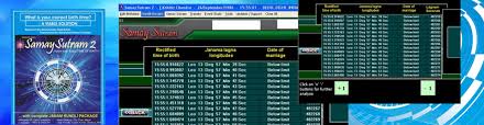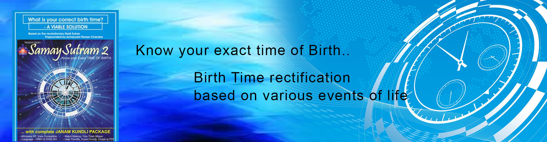 Samay Sutram software based on vedic nadi astrology for Rectification of Time of Birth, study of various events of life, event study.. A revolutionary research by Acharyasree Pawan Chandra. The salient features are as under: You can use any of the important/ landmark events of your life for birth time rectification The process of rectification of the time of birth can be carried to an accuracy of 1/1000/ of a second. Provision of the study of the Horoscope and Vargatamak Kundli based on the rectified time of birth. Vimshotri, Yogini, Gemini Dasha systems. Provision for the study and the analysis of the rectified time of birth by K.P.Systems.